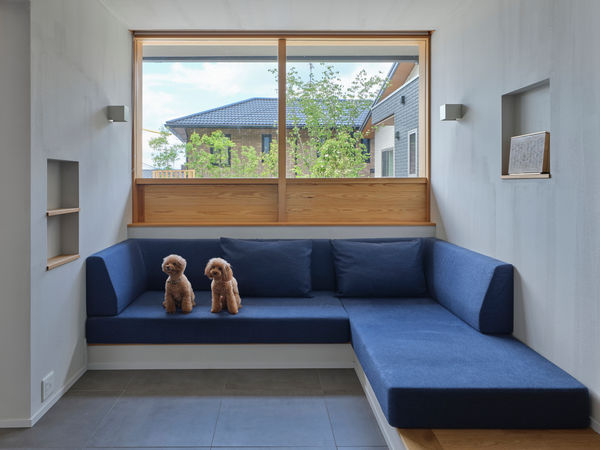 置きクッションのコーナーソファとなっている。